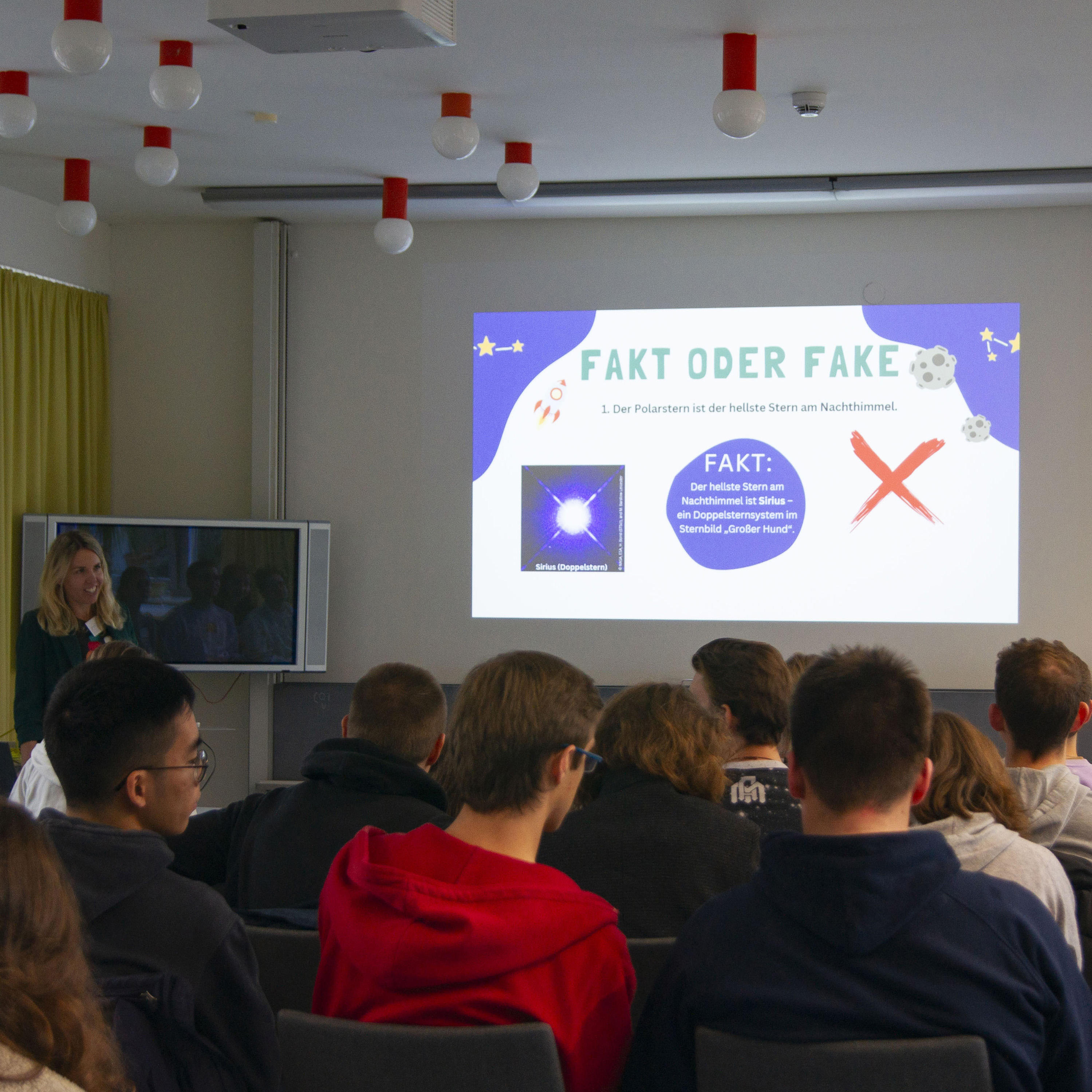 Direkt am ersten Tag fand das Highlight unserer Zusammenarbeit statt: Der Besuch am 100m Radioteleskop Effelsberg. Alle durften nicht nur ganz nah zum zweitgrößten vollbeweglichen Radioteleskop der Welt fahren, sondern bekamen auch eine Führung vor Ort. Prof. Michael Kramer, einer unserer Direktor, eröffnete die Veranstaltung und begleitete uns nach Effelsberg. Nach seinem interessanten Vortrag über die Radioastronomie nutzten die Teilnehmenden die Chance, den Herrn Kramer Fragen zu stellen. Danach war Teamarbeit angesagt: Die Studierenden testeten ihr Wissen in einem Astroquiz. Die Dr. Hans-Riegel-Stiftung hat selbstverständlich für die Gewinne gesorgt.